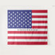 Segure-o na sua parede, use como cobertor ou como pano de fundo fotográfico, esta tapeçaria apresenta um design patriótico da bandeira americana em listras vermelhas e brancas e estrelas brancas em azul. Personalize com um nome no centro. Perfeito para festas militares de aposentadoria e festas de aniversário temáticas patrióticas. Concebido pelo artista mundialmente famoso ©Tim Coffey.