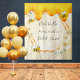 Toalha de tapeçaria divertida para chá de noiva de verão. Fundo amarelo e branco com um padrão de favo de mel. Com uma moldura geométrica em dourado falso. Decorado com flores tropicais amarelo claro, creme, hibiscos e alegres abelhas e mel dourado doce pingando. Com o texto: Noiva Abelha. Personalize e adicione o nome da noiva. Pode ser usado como decoração de parede para o chá de noiva ou como pano de fundo para fotos.