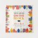 O tema da graduação "New Formando On The Block", escola elementar / pré-escola / jardim de infância, com ilustração de casas e prédios coloridos de bairro, em torno do texto, com boné de formatura no centro.