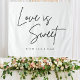O amor é doce, por favor leve um presente. Sobremesa de casamento, doces ou sinal de mesa de guloseimas em preto e branco com um design elegante. Tapeçaria moderna para recepção de casamento ou festa.