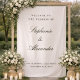 The centered layout highlights your names in flowing script, framed by understated text that welcomes guests to your celebration and includes your wedding location and date. The minimalist design allows the fabric’s soft drape and movement to create a naturally luxurious presence, making this sign a stunning focal point for your ceremony or reception entrance.