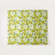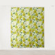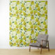 Um padrão de peras verdes vibrantes em tons de amarelo e verde com folhas verdes brilhantes. Algumas das peras são divididas pela metade para mostrar as dentro e sementes suculentas.