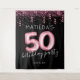 Painel de fundo personalizado para cabine de fotos de festa de 50º aniversário com fundo preto moderno, brilho rosa e confetes, 50 balões rosa, nome e data.