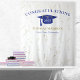 Fundo de celebração de formatura moderno para oportunidades de fotos! Brilho no topo e na parte inferior, serpentinas douradas a partir da borda superior, chapéu de formatura e letras em azul, modelo de nome em dourado. Turma de em letras cursivas douradas brilhantes com modelo de ano em branco. Adicione o ano, nome e nome da escola.