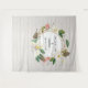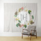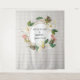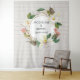 "Pano de Fundo Floral de Casamento Magnólia Branca Rústica para Cabine de Fotos." Fundo de madeira de casa rústica branca com guirlanda pintada à mão em aquarela de flores de magnólia brancas, rosas cor-de-rosa e flores silvestres amarelas e rosadas com galhos e folhagem. Seus nomes e data ou qualquer mensagem que você preferir podem ser facilmente alterados usando os campos do modelo. Direitos autorais, Audrey Jeanne Roberts.