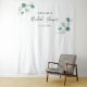 Pano de fundo elegante para cabine de fotos de chá de panela com um design simples com folhagem de eucalipto verde-sage pintada à aguarela, juntamente com o nome da noiva e a data. Este pano de fundo para cabine de fotos botânico rústico com um toque moderno é perfeito para um chá de panela de primavera ou verão.