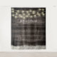 Panoramas de casamento rústico com luzes de corda e flores brancas de Bebê Respiração em madeira de celeiro.
