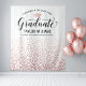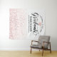 Elegante fundo de festa de formatura para fotos apresenta um capelo de graduação cor de rose gold, "Formado" em letra cursiva e texto personalizado moderno que pode ser personalizado com o nome do formando e da escola. Um padrão de confetes de falso papel alumínio rose gold caindo decora o fundo - adereço de festa perfeito para os convidados se posicionarem na frente para tirar fotos com o formando! Vários Tamanhos estão disponíveis.