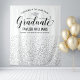 Elegante fundo de festa de formatura para fotos apresenta um capelo de formatura prateado, "Graduado" em letra cursiva e texto personalizado moderno que pode ser personalizado com o nome do graduado e da escola. Um padrão de confetes prateados caindo decora o fundo - adereço de festa perfeito para os convidados se posicionarem em frente para fotos com o graduado! Vários Tamanhos estão disponíveis.