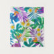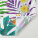 Folhas tropicais coloridas de palmeiras, monstera, flores de plumeria e aves do paraíso.