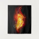 Pena de pavão brilhante feita de fogo e chamas sobre fundo negro.