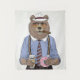 Características deste design um urso vestido que aprecia o pequeno almoço e um charuto.