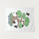 Simples ilustração de uma árvore bonsai japonesa em uma bandeja rasa. Um grupo de pequenos ninjas fez desta árvore a sua base. Vários ninjas estão escondidos atrás da folhagem. Um está balançando de uma corda amarrada a um galho, outro paira sobre a árvore amarrada a uma pipa.