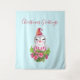Tapeçaria com um design bonitinho e caprichoso com um pinguim adorável vestindo um chapéu de santa vermelho. Ficando atrás de um buquê de flores com canas doces listradas cor-de-rosa e branca.