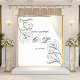 Um pano de fundo romântico e elegante, com uma design minimalista com delicadas ilustrações florais e os nomes dos casais e a data do casamento, elegantemente escritas a preto num fundo branco.
