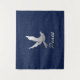 Tapeçaria em uma pomba e a palavra paz em um gradiente de efeito metálico prateado, em um fundo azul estrelado céu