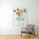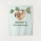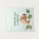Tapeçaria com uma preguiça adorável pendurada de cabeça para baixo em um galho de árvore. O galho de árvore é decorado com folhas tropicais e bagas.