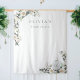 Apaixonar-se por este design botânico etéreo para chás de panela de outono, jantas de ensaio, casamentos ou festas de noivado. O Elegante design apresenta uma abóbora branca de aquarela, inscrita com as iniciais do casal e flanqueada por flores brancas, folhagem verde e folhas de eucalipto. Personalize este pano de fundo de fotos com duas linhas de texto personalizado.