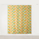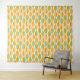 Repeating geometric pattern with overlapping leaf shapes in orange, teal, and pink on a beige background. The design conveys a retro, vibrant feel.