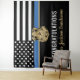 Este design apresenta uma bandeira da polícia com listras pretas e brancas, e uma fina faixa azul de linha também. Personalize com o nome do oficial de polícias, xerife, capitão ou chefe. Uma forma excelente de dizer parabéns aos novos reformados ou formandos para sua aposentadoria ou graduação na academia de polícia.