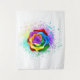 Rosa grande e florescente com pétalas arco-íris sobre fundo branco, pintadas com pedaços de tinta colorida e brilhante. 3d