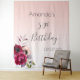 Uma tapeçaria para uma festa de aniversário de 50 anos ou de qualquer idade. Um fundo ombre de rosa dourado suave feminino e elegante. Decorado com flores em roxo escuro, burgundy e rosa. Modelos para um nome, idade e data. O texto: Aniversário de 50 anos é escrito em preto com uma letra manuscrita moderna grande. Perfeito como decoração para a festa ou como fundo para fotos.