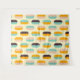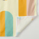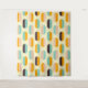 A seamless geometric pattern features vertical, oval shapes in soft yellow, teal, peach, orange, and brown, creating a retro, playful vibe.