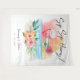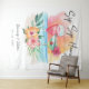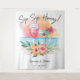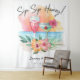 Tema tropical casais chuveiro, noivado ou festa de casamento fundo apresenta um pôr do sol na praia aquarela, coquetéis, flores de hibisco e folhas de palmeira com uma legenda "Sip Sip Hooray" em letra manuscrita. Perfeito para celebrações de tema praia, verão, mar, luau e tiki.