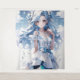 Bonito sereia com cabelo azul e tapeçaria de vestido branco e azul.