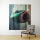 Shark sculpture on the beach, in the style of rendered in cinema4d, surrealistic grotesque, dreamlike illustration, dark cyan and green, concept art, gigantic scale, fish-eye lens