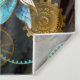 Barbeiro véu com asas transparentes azuis e lâmpada verde sobre fundo vestido, marrom, texturizado. Estilo Steampunk.