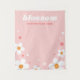 Tapestry banner featuring white strawberry blossom on a pink background and your company name in a retro font.