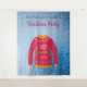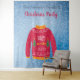 Uma tapeçaria para uma temporada de férias divertida e festas de Natal, jantares. Um fundo azul com neve. Decorado com um suéter de Natal feio vermelho, branco, laranja e verde. Personalize e adicione o nome da sua família, letras pretas. O texto: Festa de Natal é escrito em vermelho com um estilo de letra manuscrita moderna. Pode ser usado como um sinal de boas-vindas, decoração de parede de festa ou como pano de fundo para cabine de fotos.