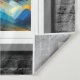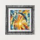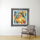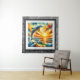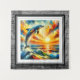 A tapeçaria é uma pintura colorida de um golfinho saltando da água no pôr do sol. O golfinho é o ponto focal da imagem, e seu corpo é arquivado em uma curva graciosa. O sol é uma grande órbita vermelha afundando abaixo do horizonte, lançando um brilho quente no céu e na água. A água é pintada em tons de azul, verde e roxo, com mapas brancos nas ondas. No canto inferior esquerdo da imagem, há algumas formas escuras que podem ser rochas ou algas. O estilo artístico da imagem lembra a arte popular ou a ilustração. As cores são ousadas e planas, e os pincéis são simples e expressivos. A impressão geral é de alegria e movimento.