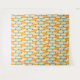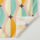 Symmetrical retro pattern with interlocking teal, yellow, and orange shapes on a beige background. Black star-like accents add contrast, creating a vintage feel.