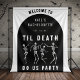 Ponha o tom para uma celebração arrepiante com este pano de fundo "Til Death Do Us Party". A design apresenta esqueletos dançantes dentro a um arco preto de tombstone, dando a sua festa de solteira uma vibração gótica e assustadora. É perfeito para operações fotográficas, acrescentando um toque divertido e estranho à decoração. Ideal para noivas abraçarem temas escuros, sujos ou inspirados no Halloween.
