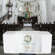 Um belo sinal de toalha de mesa de festa temática de Batismo com coroa de folhas de oliveira ideal para o seu Batismo. Personalize este sinal de tapeçaria de Batismo único e crie uma bela decoração de mesa para a celebração da festa do seu Batismo ou evento religioso. Esta tapeçaria de mesa de buffet de Batismo da família é versátil, pois pode ser usada na mesa de jantar, como faixa suspensa, na mesa de lanches ou bebidas, etc.