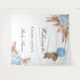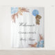 Uma tapeçaria de boas-vindas para um chá de bebê elegante e moderno. Um fundo branco decorado com grama pampas em estilo boho, flores em rosa dourado e azul claro e um ursinho menino segurando um balão. Personalize e adicione um nome.