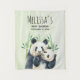 Tapeçaria de chá de bebê com uma ilustração fofa em aquarela apresentando uma mamãe e um ursinho panda preto e branco se aconchegando juntos. A mamãe está segurando seu filhote entre alguns talos de bambu verde.