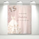 Uma tapeçaria de boas-vindas para uma festa de 15 anos de Quinceañera, glamourosa e feminina. Um fundo metálico falso dourado rosa decorado com purpurina prateada falsa e um vestido. Personalize com data e nome. O número 15 é escrito com uma fonte estilo balão.