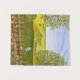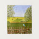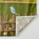 Uma tapeçaria com uma bela imagem de uma cena da natureza: Um pássaro sentado numa cerca intacta, flores silvestres crescendo ao redor da cerca, um fazendeiro no trator, trabalhando sua terra, árvores com folhas e fazendas com várias cores. Arte original por W.B.