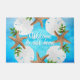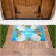 Tapete de entrada temático de praia para a temporada de férias. Grandes dólares de areia brancos e estrelas do mar marrons com azevinho verde formam uma "coroa" sobre a água azul do oceano. Personalize com uma saudação no centro, como "Feliz Ano Novo" ou "Feliz Natal".