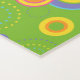 O padrão brilhante e colorido apresenta círculos multiformes de vários tamanhos e cores sobre fundo verde-grama.