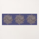 Este tapete ioga apresenta um padrão elegante de três grandes mandalas douradas sobre um fundo azul marinho.