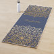 Um elegante tapete de ioga, perfeito para seus exercícios. Com um fundo azul adorável, há designs florais de mandala de ouro no topo e no fundo, no centro do tapete, na tipografia dourada, você pode adicionar seu nome. Se preferir o tapete sem o seu nome, você pode simplesmente excluir o texto modelo.