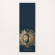 A antiga lua solar celestial de ouro encara um tapete ioga, personalizado com seu nome, num fundo negro azul-da-noite. Negrito e etéreo.