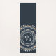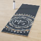 Um padrão geométrico simétrico de cor azul e abstrato branco, artístico e bonito, em forma de tanga, no estilo de mandala, com as suas iniciais no centro. O reverso do tapete é vazio.
