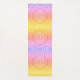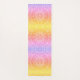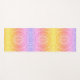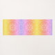 Um tapete ioga com gradiente de cores violeta a amarelo, com padrão de mandalas brancas.