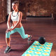 Um legal padrão retrô com alguns elementos modernos do século Médio neste tapete personalizado de ioga.