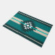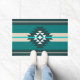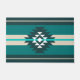 Padrão étnico boêmico asteca com formas geométricas em branco, bege e turquesa em fundo listrado